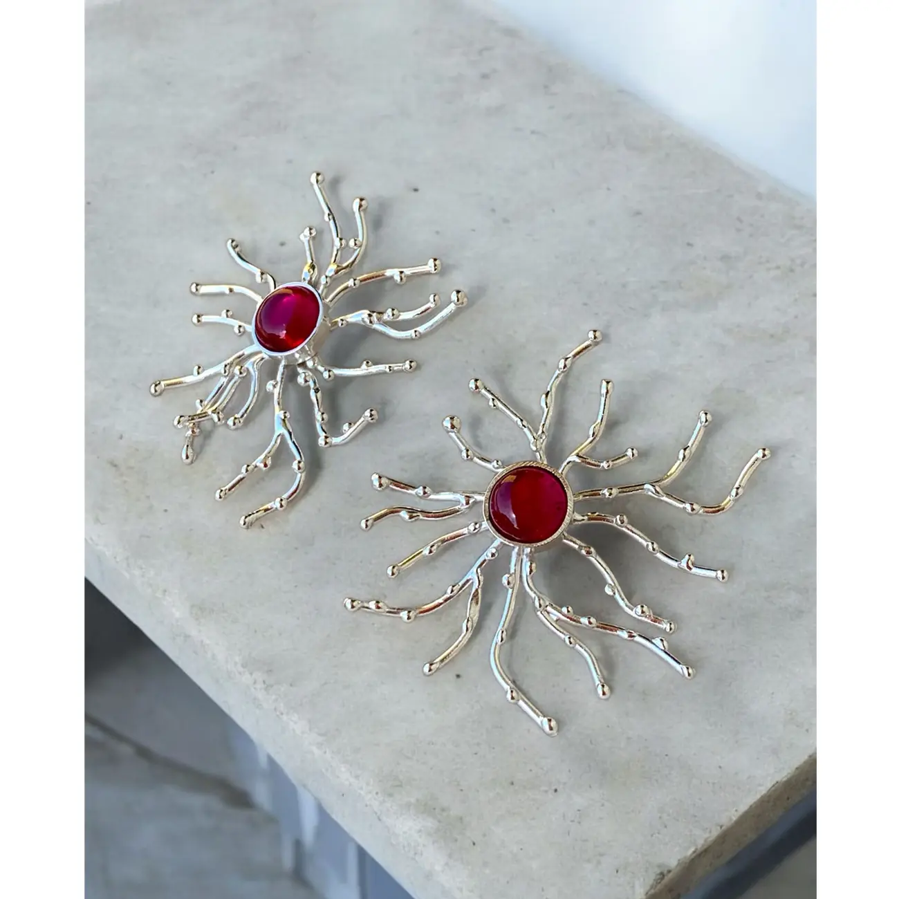 Gümüş Güneş Küpesi Kırmızı Yakut ile